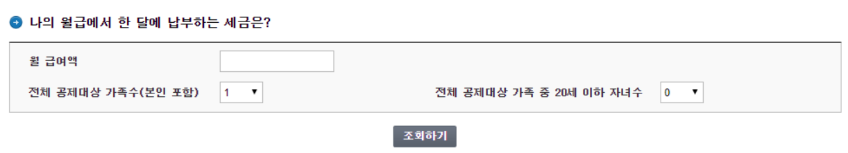 '나의 월급에서 한 달에 납부하는 세금은?' 아래에 월급여와 공제대상 가족수를 입력하고, 20세 이하 가족수를 작성한 후 조회하기를 확인하면 자동계산이 됩니다.