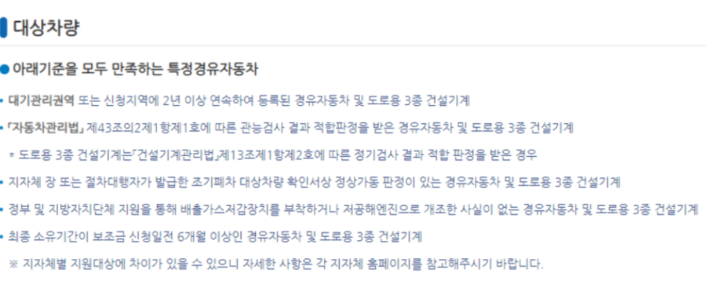 3) 최종 소유기간이 보조금 신청일전 6개월 이상인 경유 자동차 및 도로용 3종 건설기계 4) 「자동차관리법」 제43조의2제1항제1호에 따른 관능검사 결과 적합판정을 받은 경유 자동차 및 도로 용 3종 건설기계