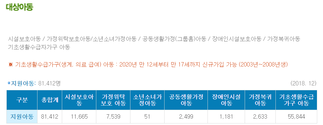 ※ 기초생활수급가구(생계, 의료 급여) 아동 : 2020년 만 12세부터 만 17세까지 신규가입 가능 (2003년~2008년생)