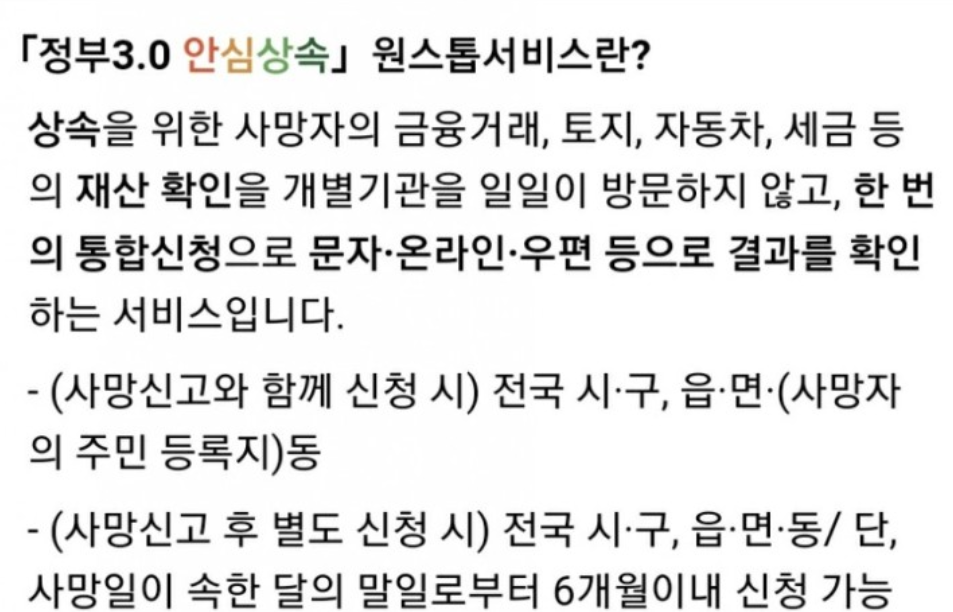 이것은 상속을 위한 사망자의 재산 확인을 한 번의 통합신청으로 문자, 온라인, 우편 등으로 결과 확인이 되는 서비스입니다.