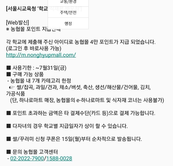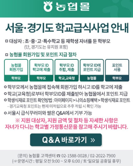 서울형 학생 식재료 바우처 신청 방법은 그리 어렵지가 않습니다. 농협몰에 들어가서 회원가입을 해줍니다. 그 후 id를 학교에 제출하면 며칠 후에 바로 포인트 적립 안내 문자가 옵니다.