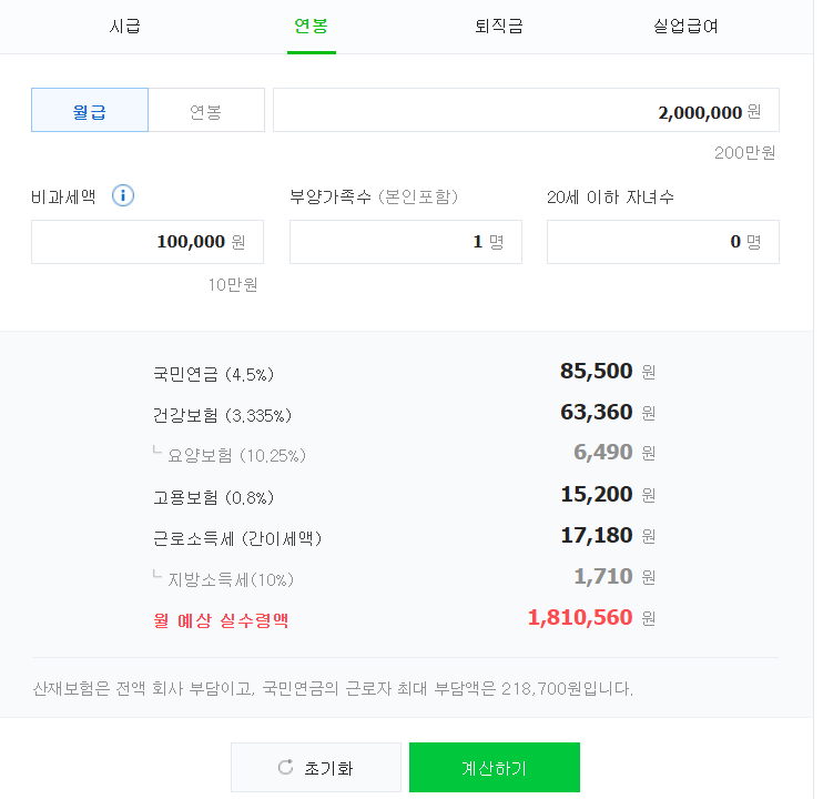 또한 네이버 계산기에서 계산해봐도 답을 알 수가 있는데요, 200만원 월급의 경우에는 아래처럼 세금을 떼고 180만원을 수령하게 됩니다.