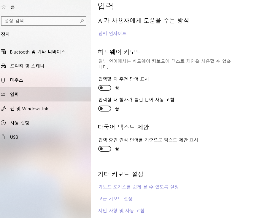 설정-장치 관리자-키보드로 들어가서 키보드의 드라이버를 삭제를 한 후 다시 설치해봅니다.