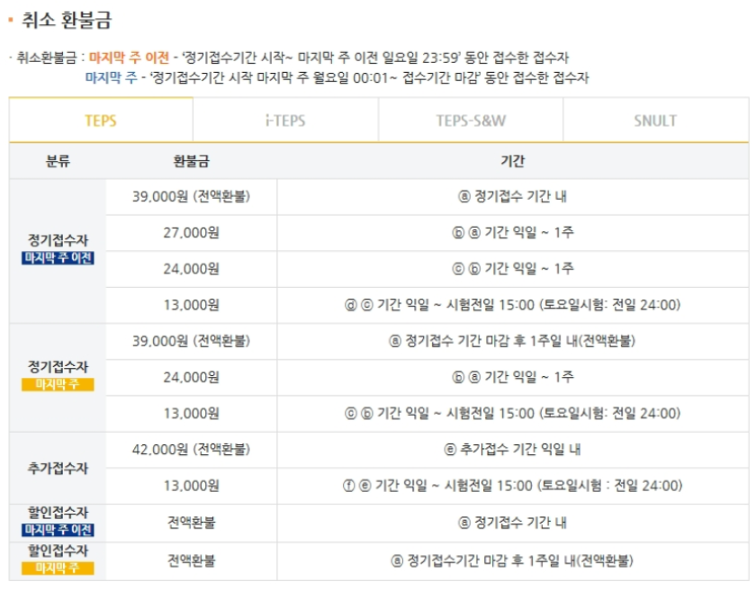 - 환불규정: 미접수 시 90%환불 / 1회 이상 접수 시 응시 횟수만큼 정기접수 금액인 39,000원을 차감 후 나머지 금액의 90% 환불