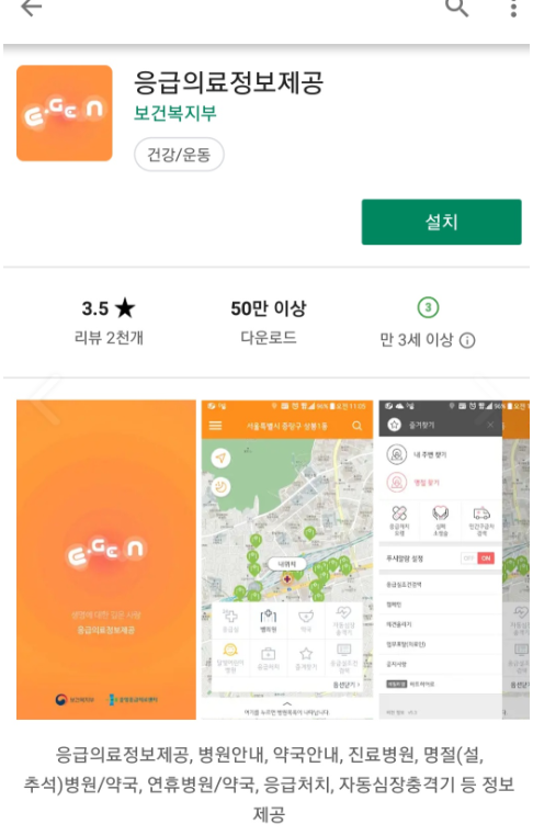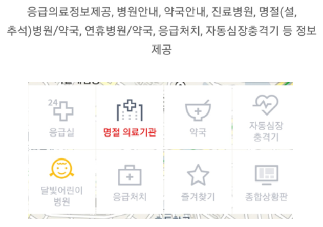 특히 앱 안에 명절 진료 병원 찾기도 찾아볼 수 있어 편리합니다. 앱 이름은 응급의료정보제공이며 보건복지부에서 제공하는 앱입니다.