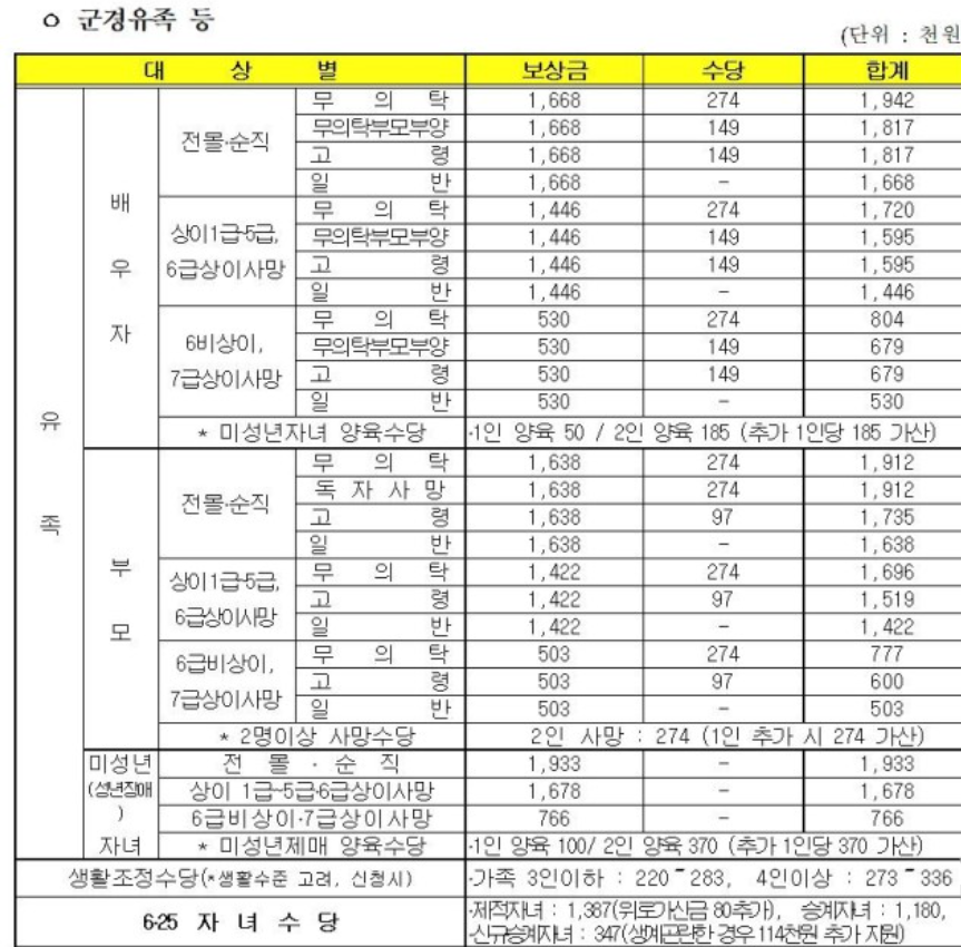 추가적으로 간호수당은 5% 인상, 생활조정수당은 3% 인상, 신규 6.25 자녀수당은 28.5% 인상이 되었습니다. 참전명예수당 및 무공영예수당 2만원이 인상되었습니다. 독립유공자 유족 생활지원금은 만원이 인상되었습니다.