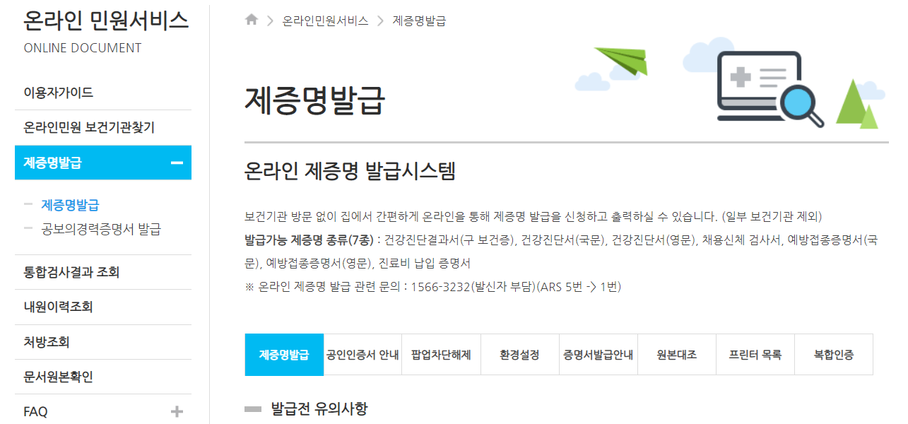그러면 여기에서 굳이 병원 방문을 하지 않고 집에서 편하게 제증명 발급이 가능합니다. 아래 7종의 서류들이 가능합니다.