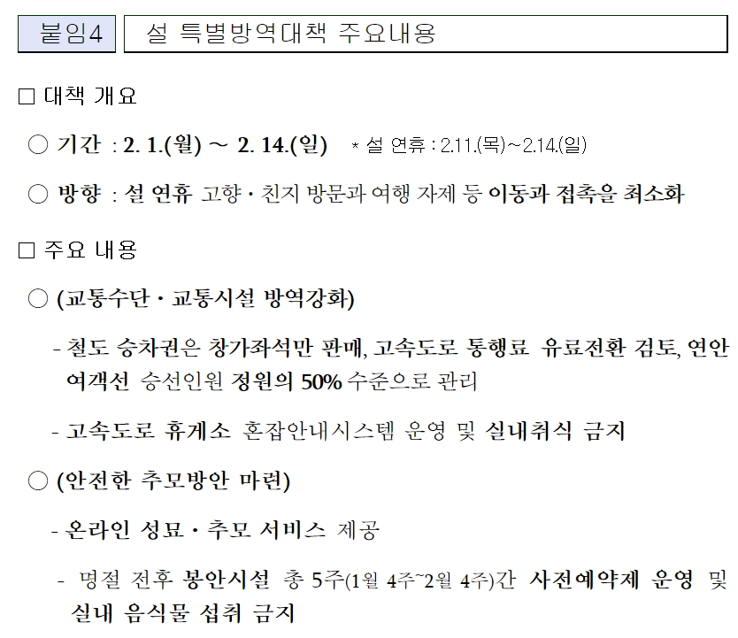 이렇게 설 연휴에는 특별방역대책이 있어서, 철도 승차권도 창가만 예매 가능하고 고속도로 휴게소도 실내 취식이 안 되고 포장판매만 가능합니다.