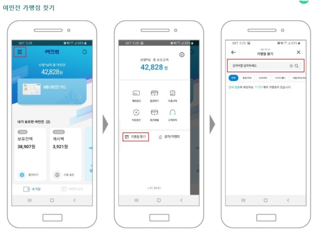 추가적으로 가맹점을 앱으로 찾아볼 수가 있습니다. 앱으로 들어가신 후에 '가맹점 찾기'란으로 들어가시면 내 지역 근처의 가맹점을 확인할 수가 있습니다.