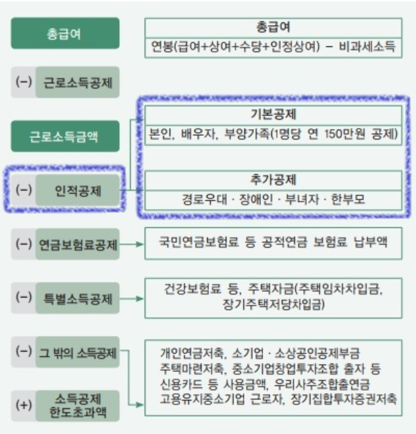 1. 기본공제: 본인, 배우자, 부양가족 (1명당 연 150만원 공제)